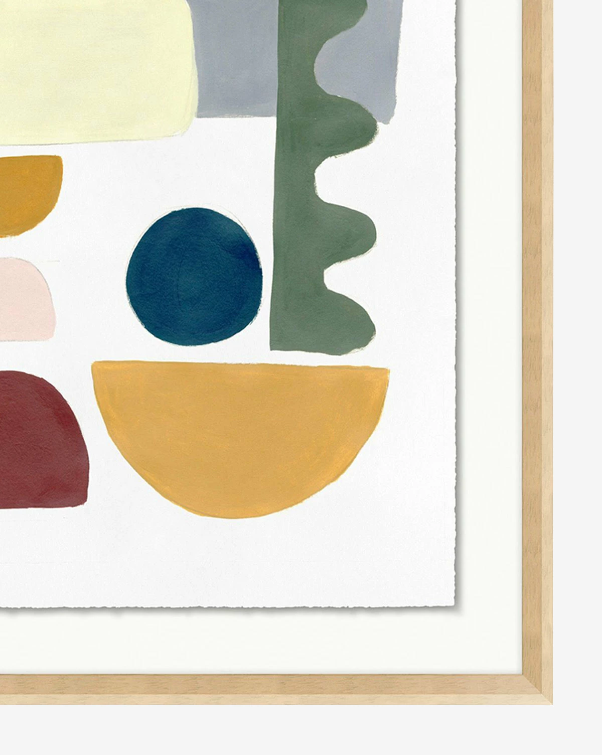 In a composition that embraces shape and tone, Abstract Shapes I brings intriguing brightness to artwork in the home. Colorful objects are playfully arranged throughout the piece, lending a whimsical yet sophisticated element to your decor. A giclee print on watercolor paper within a blond maple frame, this abstract piece is presented with gallery-quality materials.