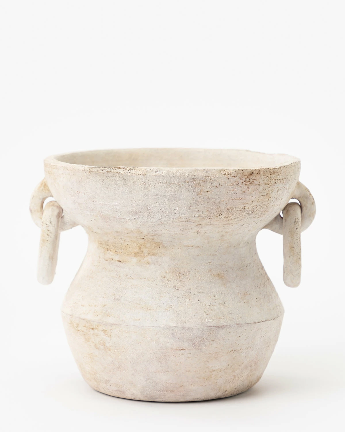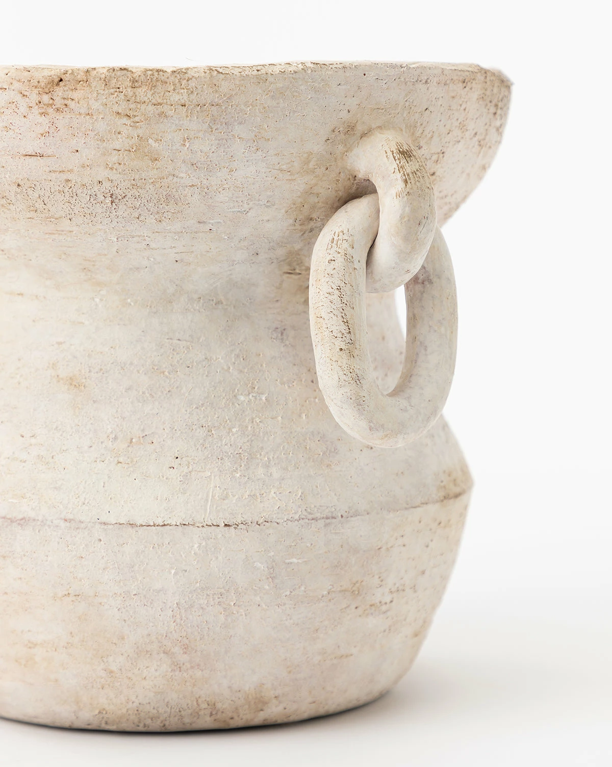 With a unique form, the Arnette Terracotta Vase has a subtle presence that elevates vignettes with its textural detail. Handmade from terracotta clay with an aged white finish, the vase has rustic qualities that complement its bowl-like opening and elegantly looped handles.