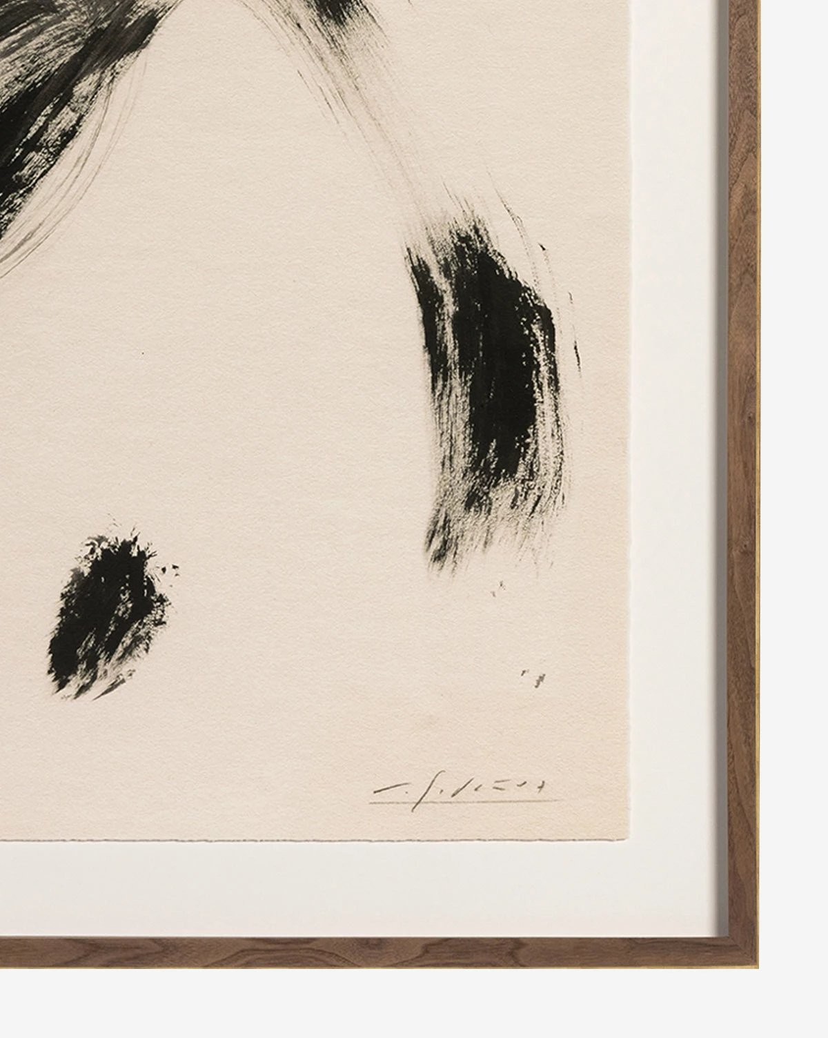 Abstract and full of contrast, Black Paint Stroke is presented on textured fine art paper, depicting bold brush strokes within its intentional composition. Using minimalistic principles, the piece makes a statement among your decor within its sleek rustic walnut frame.