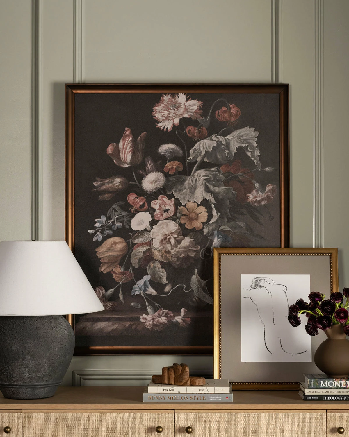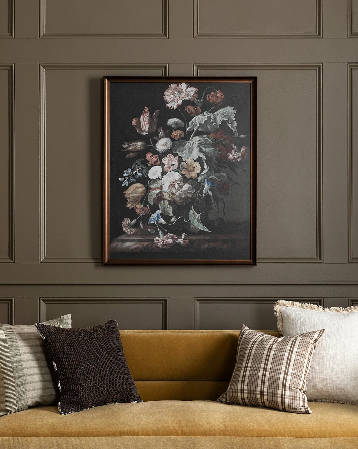 Elegant and moody, Botanical Renaissance brings beauty to your space in the form of a lush vase of flowers contrasted against a dark background. Presented within a bronze-finished frame, this piece brings gallery-quality materials to your decor.