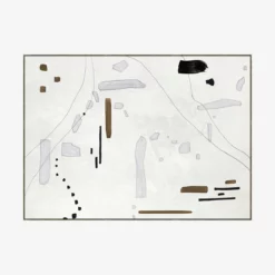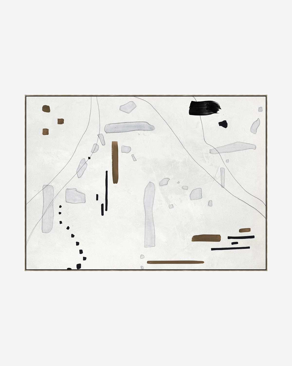 Entirely abstract, Field of Movement plays with a tonal color scheme and unique shapes to create a visually beautiful art piece. Its contrasting shades of brown, black, and cream work with thin, intentional lines to help direct the eye and create movement throughout the canvas.