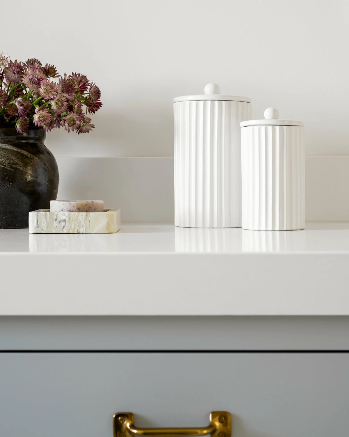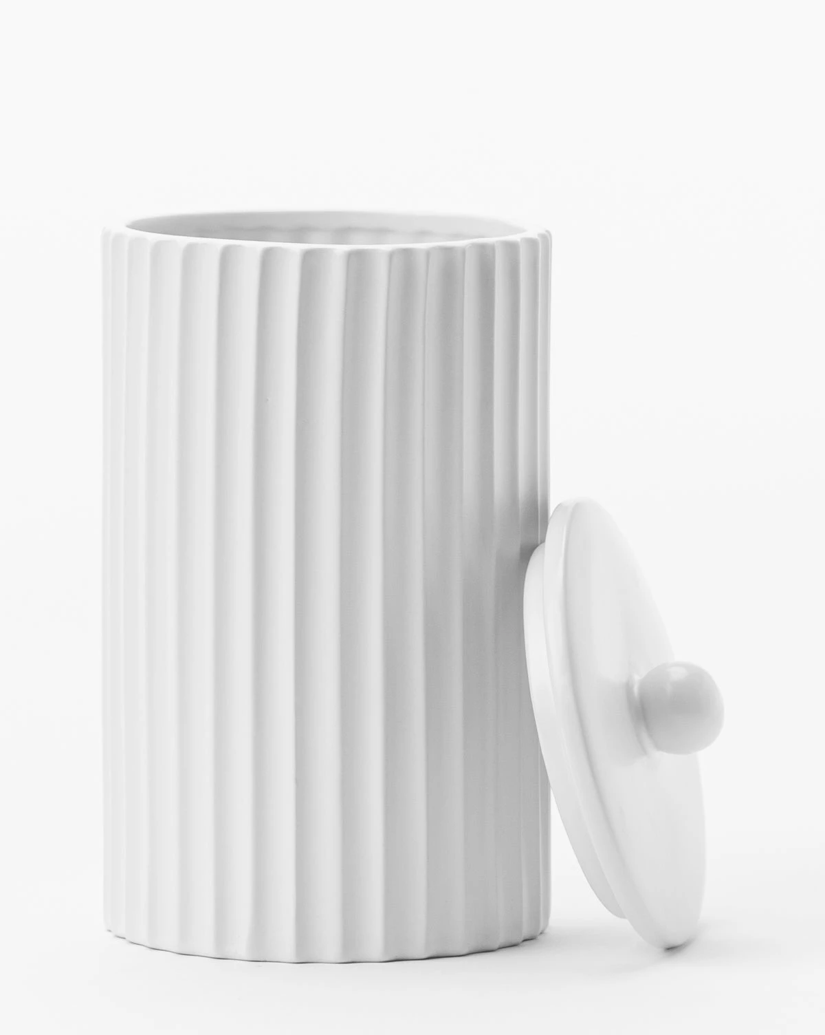 Fluted edges give texture and detail to the simple, clean Fluted Lidded Bathroom Canister. Crafted from ceramic in a smooth white finish, this canister is topped with a straightforward lid designed with a subtle knob handle. Bringing organization and delicate detail to the bathroom, the Fluted Lidded Bathroom Canister is an essential bathroom accessory.