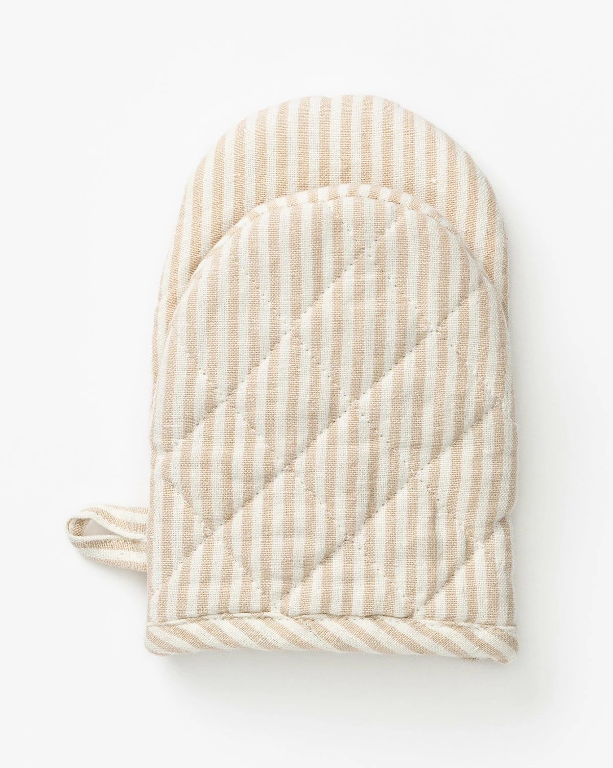 A palette of taupe and white gives contrast and dimension to the French Linen Oven Mitt. With a striped motif, the oven mitt brings a classic feel to your kitchen accessories. The cotton and linen construction of the mitt lends itself to comfort and lasting practicality.