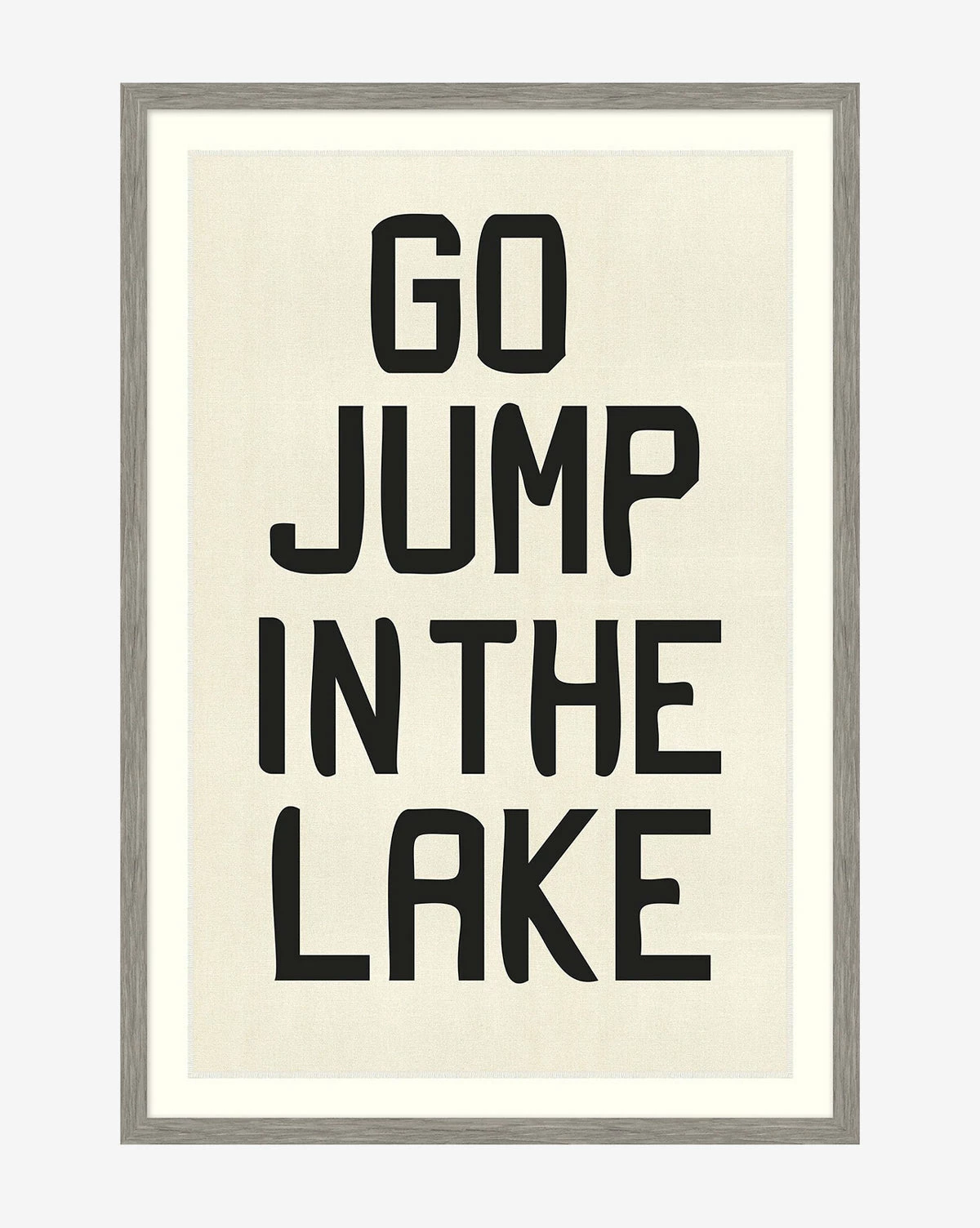 With the feel of a vintage camp flag, Go Jump in the Lake brings power and simplicity to your decor. The giclee print on raw canvas has frayed edges and is mounted on a mat in a shadowbox, for extra textural display and a refined gallery feel.