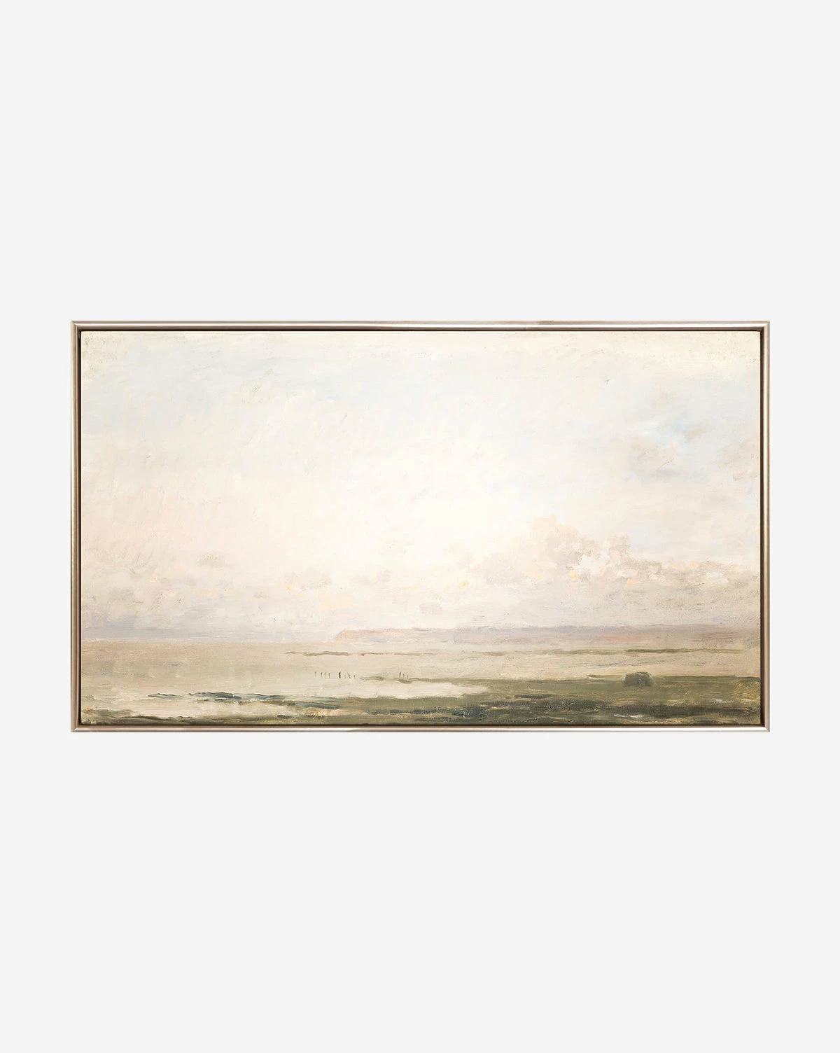 Soft brushstrokes of blush and olive create the serene scene of our Hazy Beach piece. Quintessential clouds in the distance play with depth and dimension through a masterful use of color.