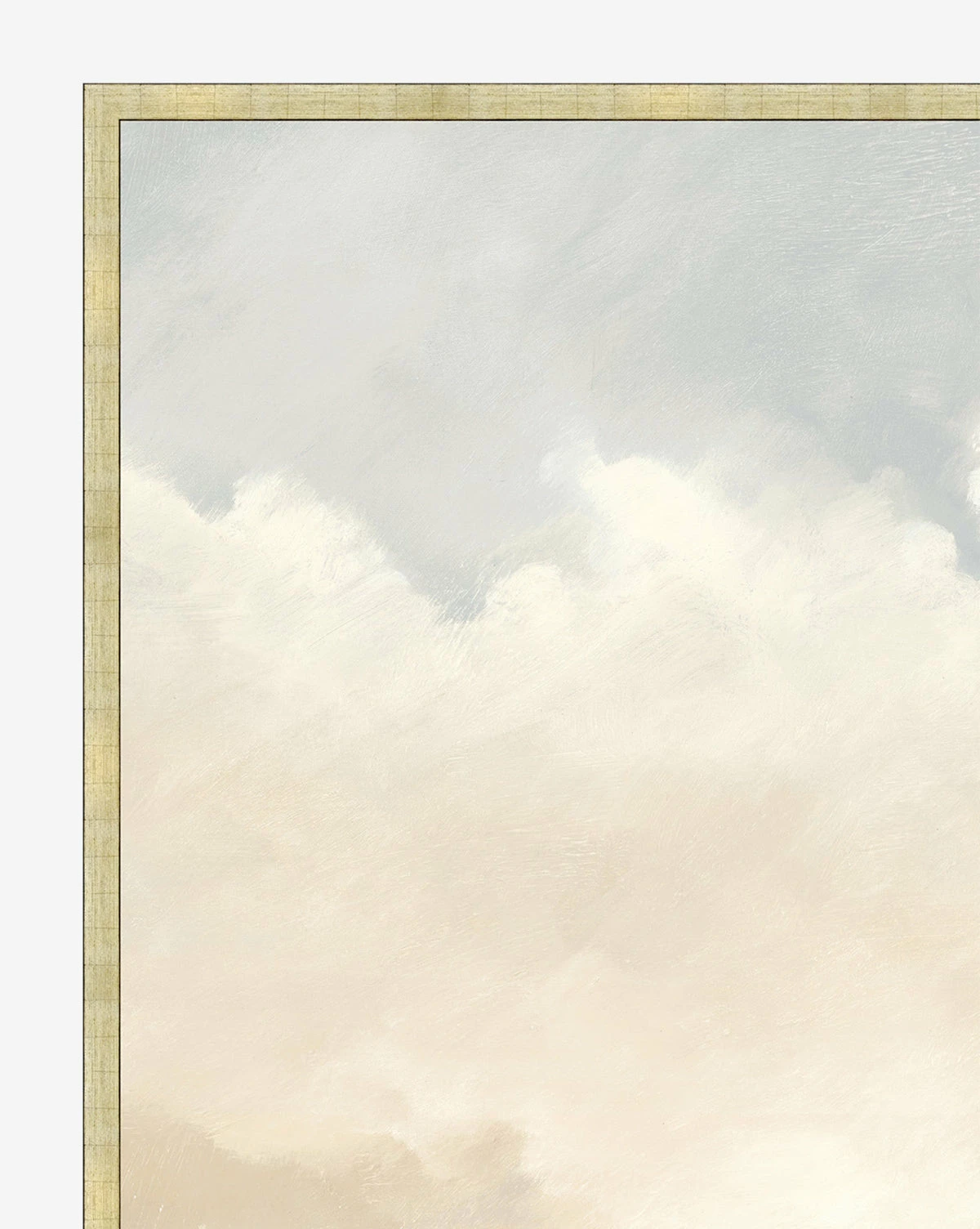 With cotton candy colored clouds, this piece evokes serenity through its stunning use of muted color. From the marshy greens, to the tonal clouds laying on the water, this painting looks right at home styled above an entryway console.