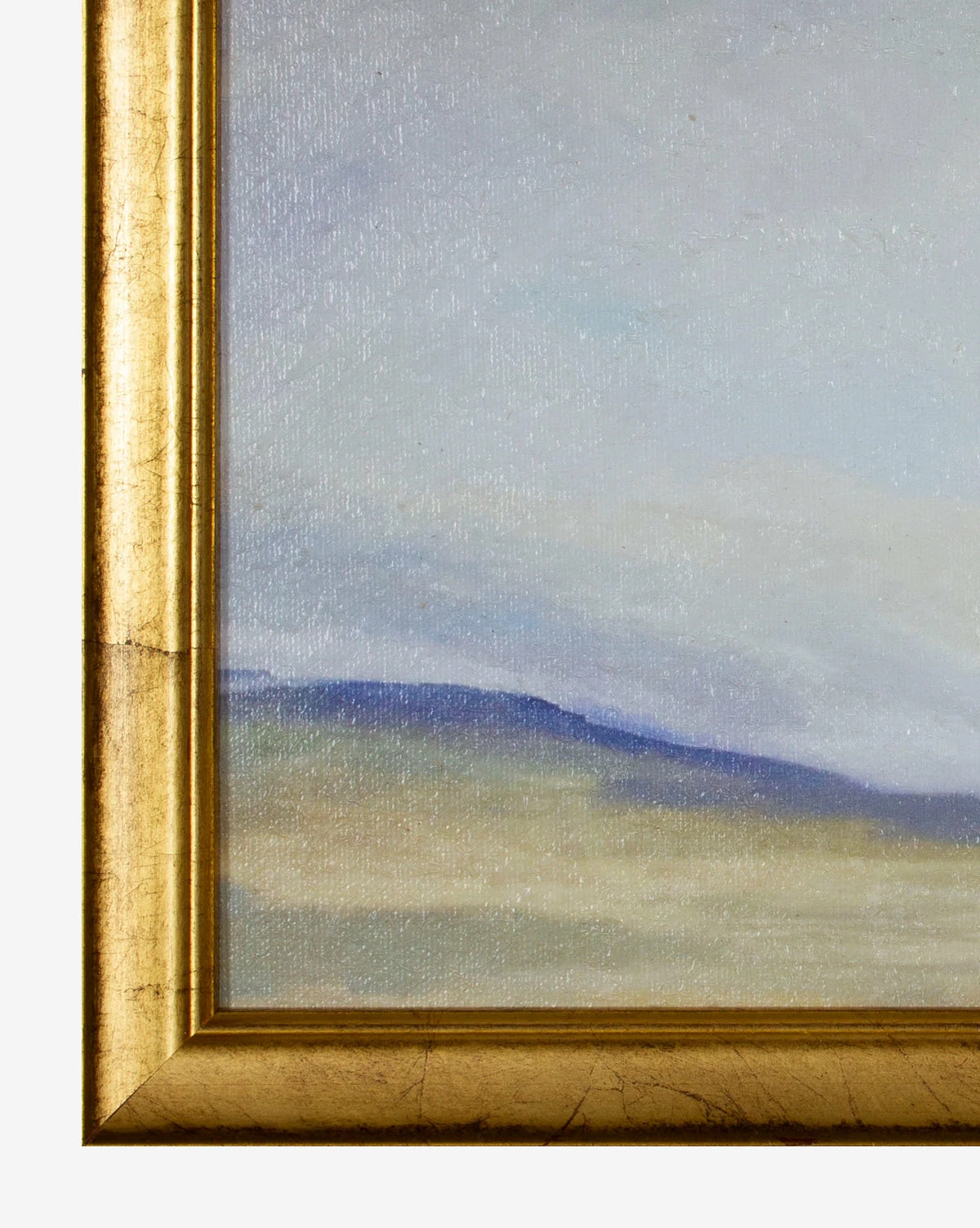 A serene pastel landscape, Indigo Skyline is a beautiful mix of blue and natural tones. A gold wood frame gives the piece a bold presence in your space, elevating wall treatments or dresser vignettes.