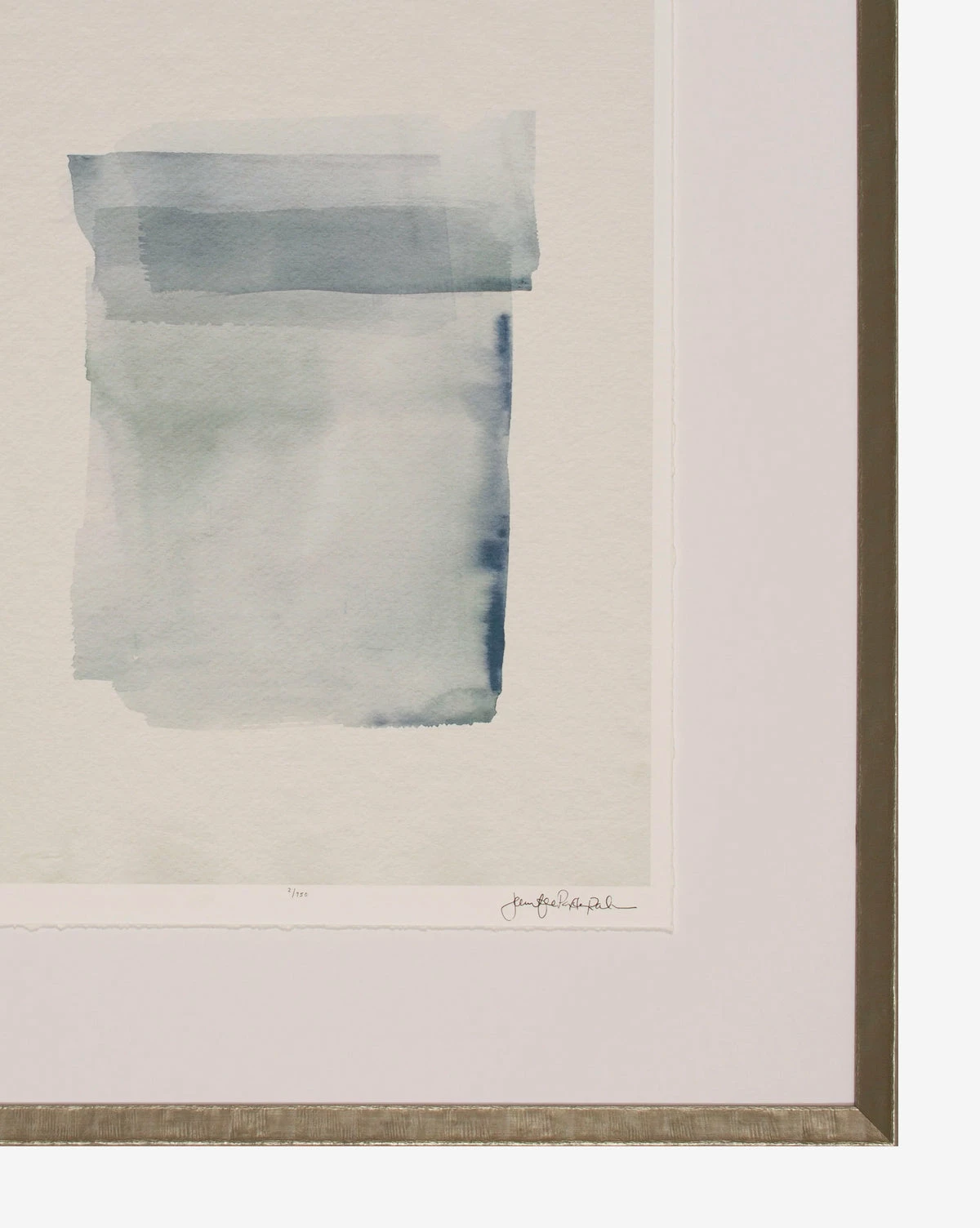Abstract and serene, Jade Abstract beautifully plays with tones of blue. The watercolor print on textured fine art paper draws attention to the intentional brush strokes within its minimalistic composition, adding depth to your decor whether styled alone or as a collection.