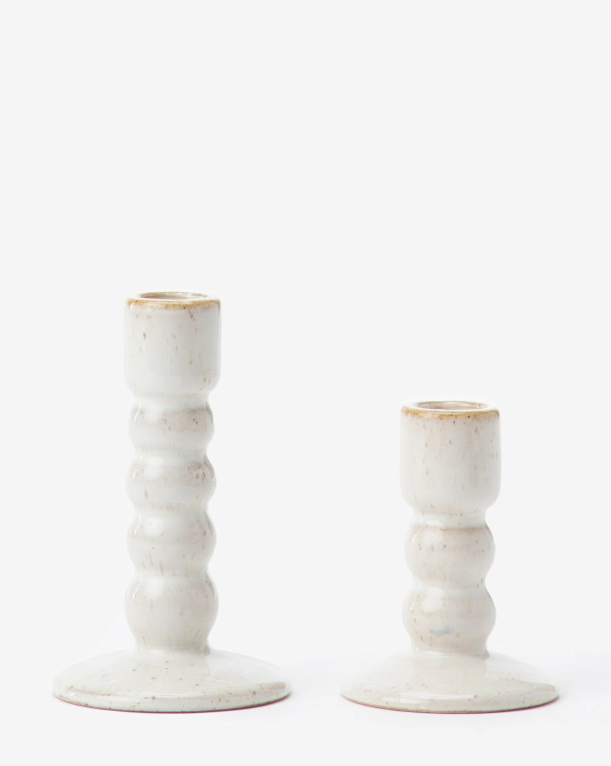 Crafted from stoneware with a hand-applied white glaze, the Mae Ceramic Taper Holder brings a classic feel and shapely personality to your mantel or console vignette. Its simple stacked shape brings subtle interest to your taper candles wherever they are styled.