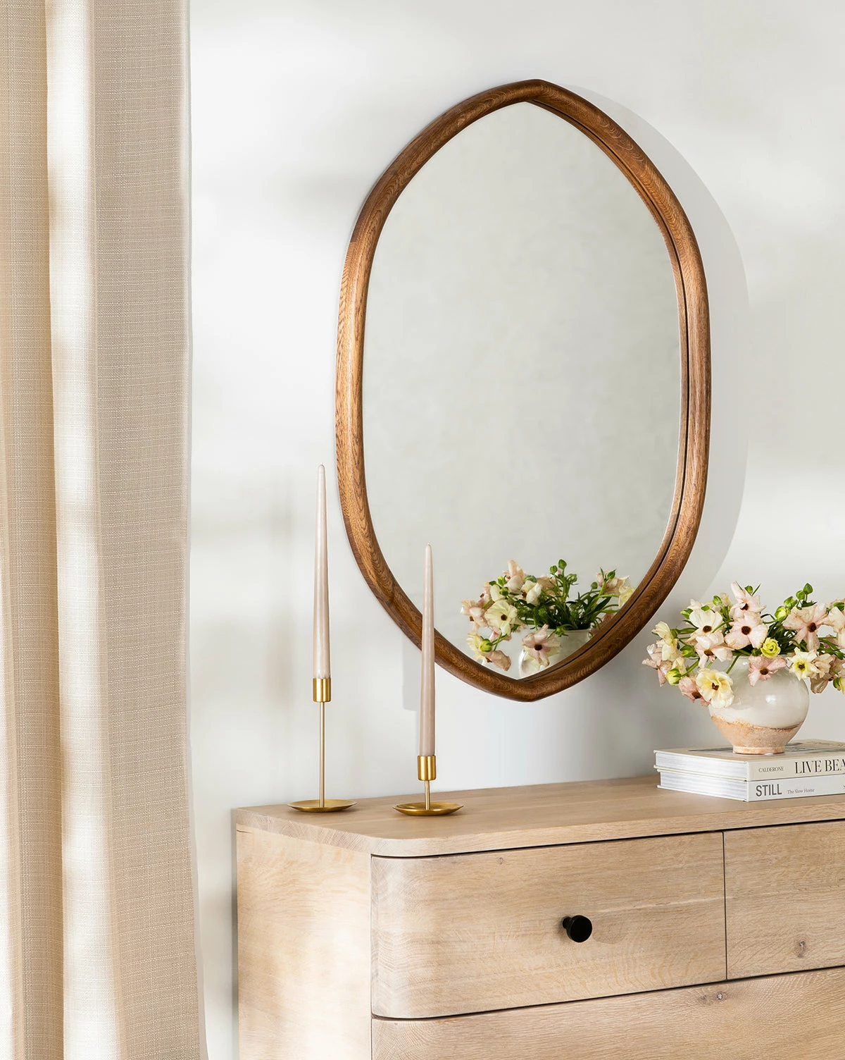 Designed in a tapered oval shape that gives an updated feel to the classic mirror, the Oslo Mirror brings a charming level of detail to wall treatments. Its oak frame is given a walnut finish, lending a sense of traditionalism to this refreshingly approachable design.