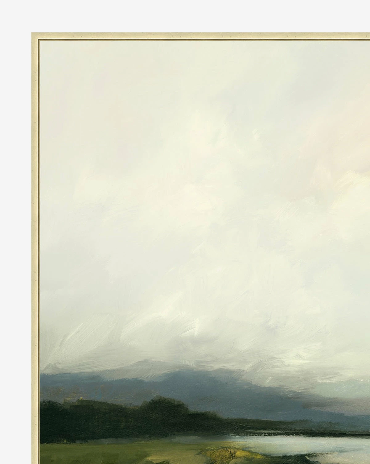 Stunningly rich with a romantic feel, Overcast Wetland is a capturing piece in a deep palette of warm green hues and luminant blues and cream. Giclee printed on gallery-wrapped canvas, the piece is artist-enhanced by experts to maintain texture and an original feel. Printed in a large scale, Overcast Wetland can be styled over sofas or beds to give a nuanced, emotive touch to the space.