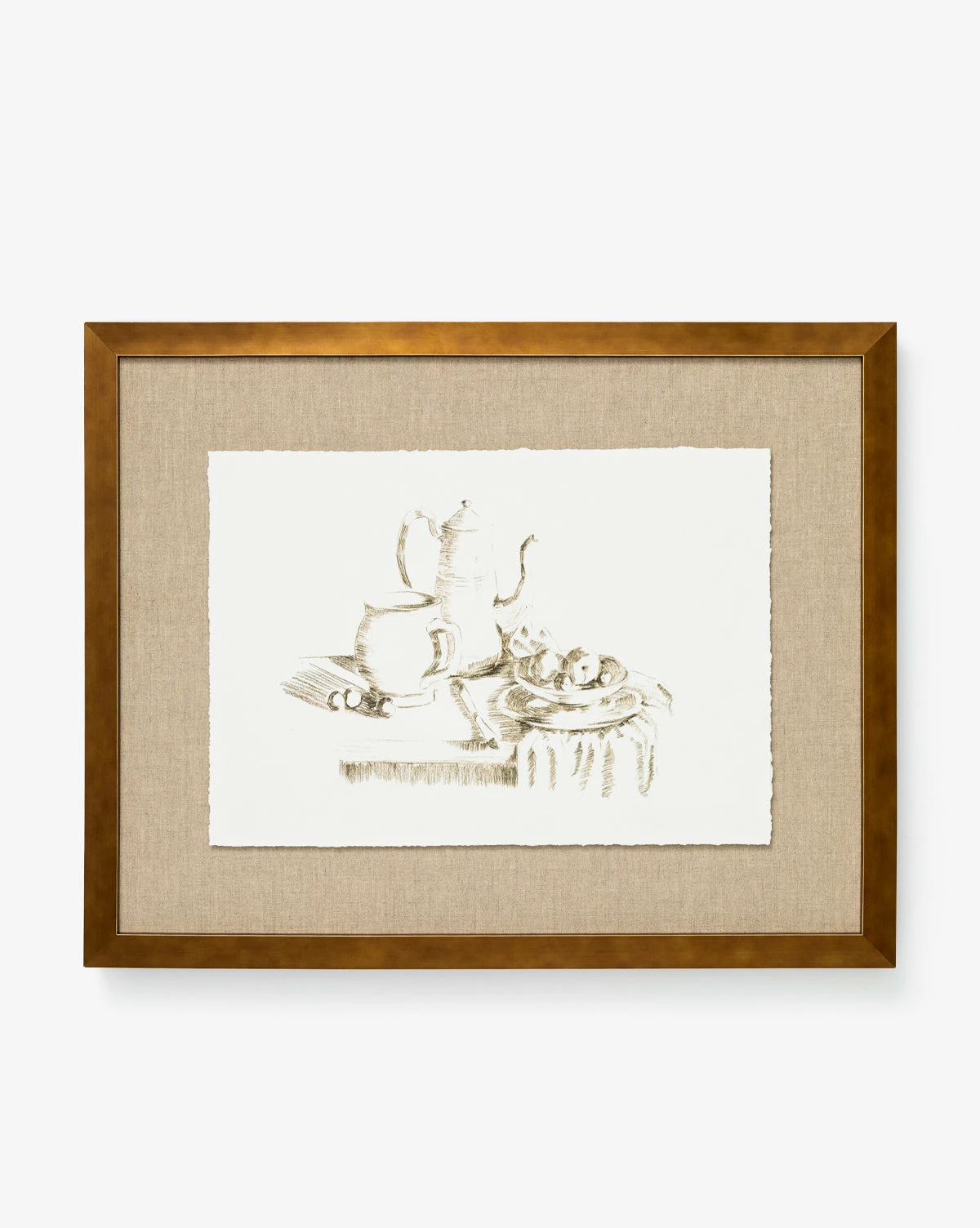 With expressive linework and a full composition, Penciled Apricots has a delicate yet inviting feel. The still life depicts a table setting with pitchers, textiles, and a bowl of apricots. With a gold-finished frame, the piece brings gallery-quality materials to your space.