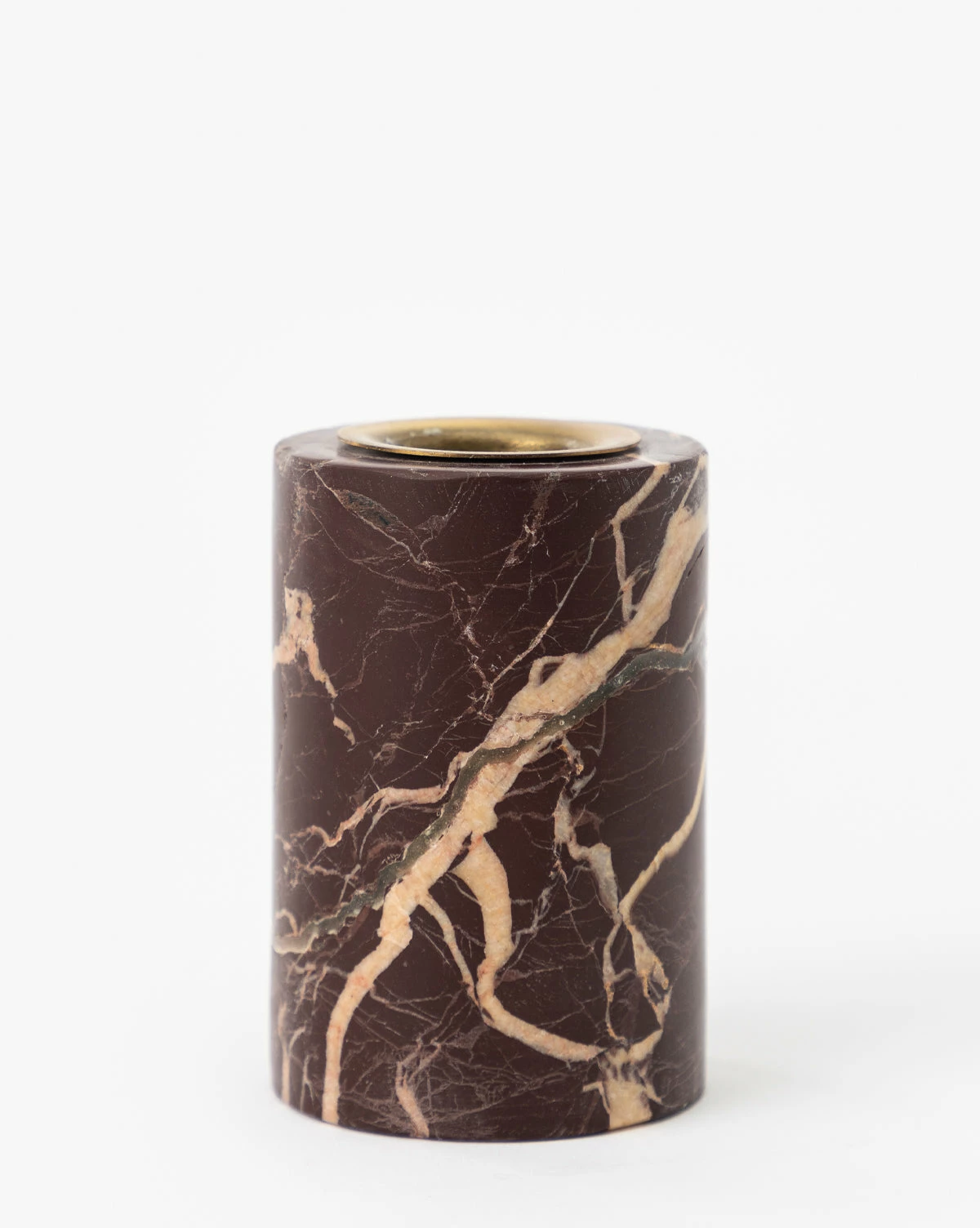 The sleek cylindrical shape of the Perrin Marble Taper Holders is crafted from a richly colored marble, giving visual weight to this simple yet elegant design. Marble details swirl through the piece to create movement and provide complementary detail to the brass cap, beautifully framing the slender candle it holds.