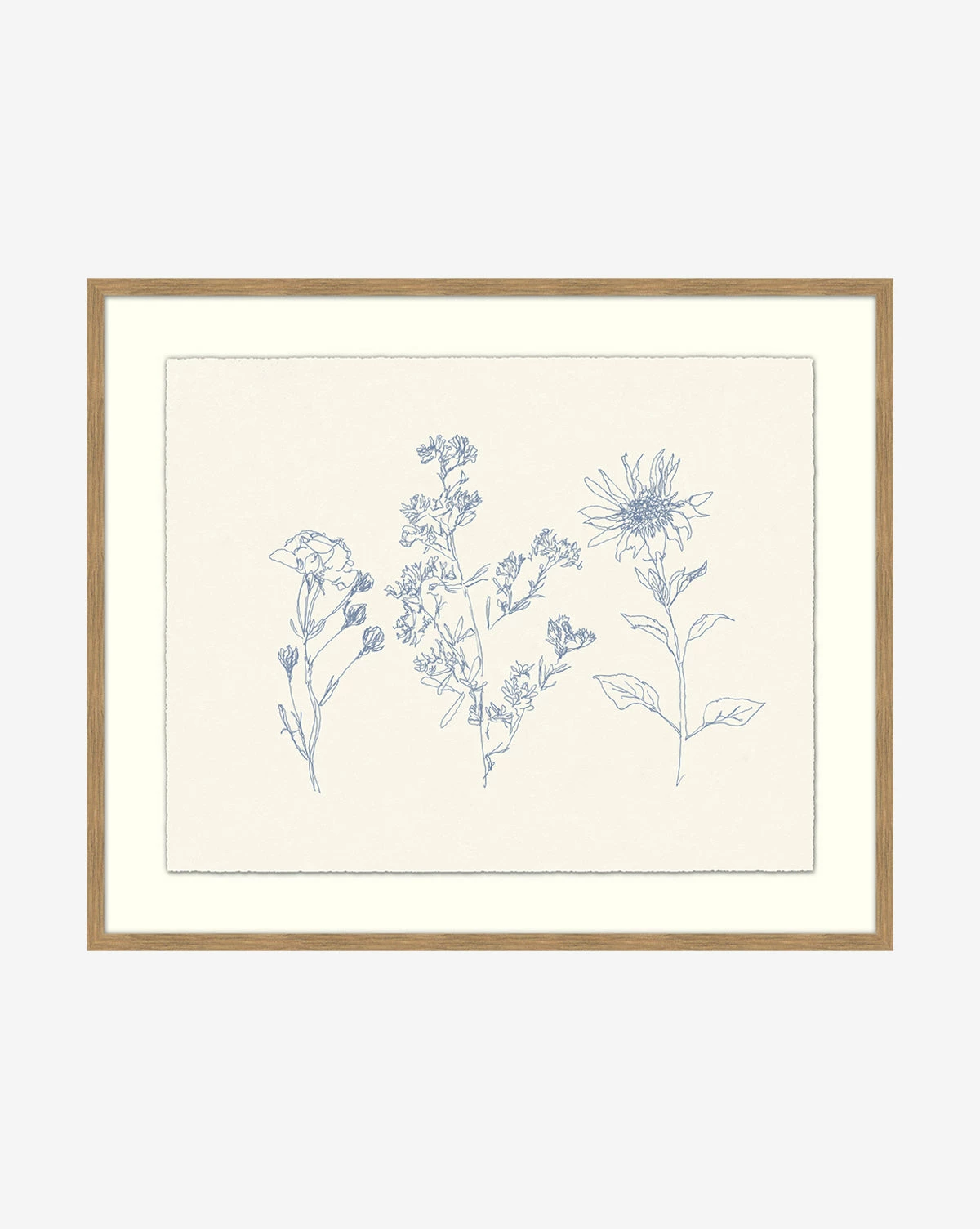 Sketched in a deep, slate blue on white deckled paper, Petits Fleurs depicts three species of flowers in an airy style. The raw nature of the physical print contrasts with the delicate nature of its linework and is completed with a thin wood frame in a natural finish. Its thin, intentional lines explore the intricacy and elegance of each flower, bringing a gentle touch to the room.