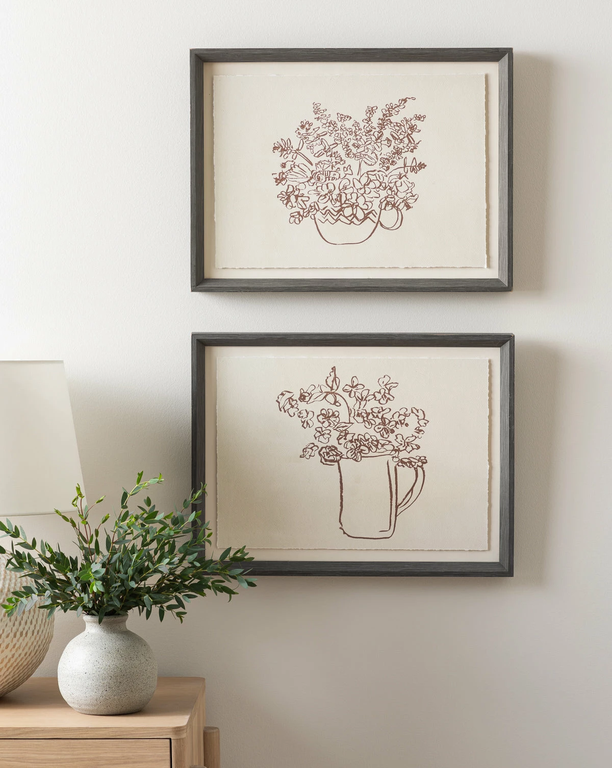 With simple brushstrokes and a unique composition, Pitcher of Flowers has a whimsical and inviting feel. The botanical still life depicts a pitcher full of small flowers bringing a playful and illustrated detail to your decor within its charcoal wood grain frame.