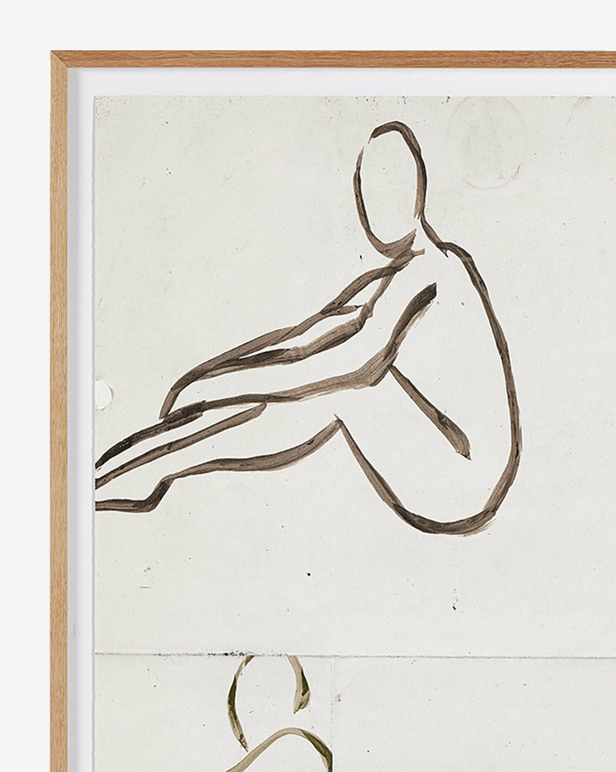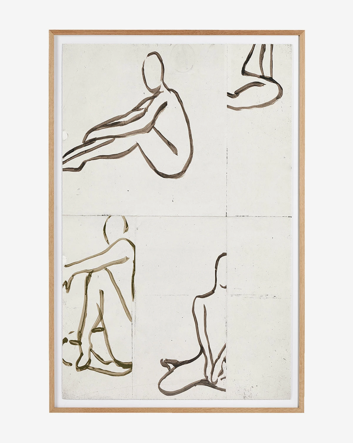 Minimalistic outlines of posed people in a unique composition, Poses features simple brush strokes. With a vertical grain white oak finished frame, the giclee print on textured fine paper captures the artistic process.