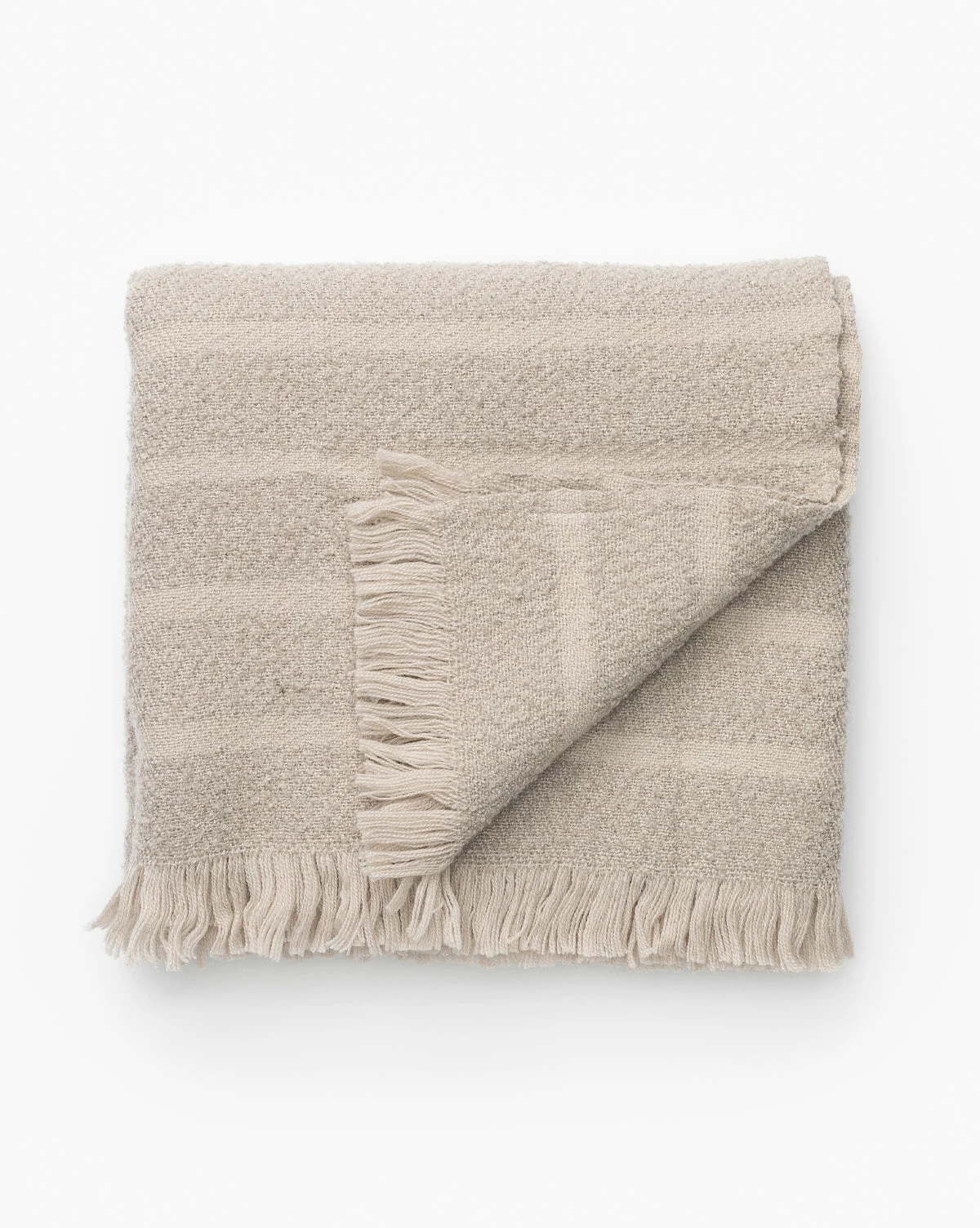 With bold gray stripes and a subtle fringe, the Quinlan Boucle Wool Throw is cozy and versatile. The boucle blanket is also textural, allowing for easy layering with bedding or on a sofa or ottoman. Designed specifically for comfort, the throw’s wool and acrylic blend gives it a full and soft feel.