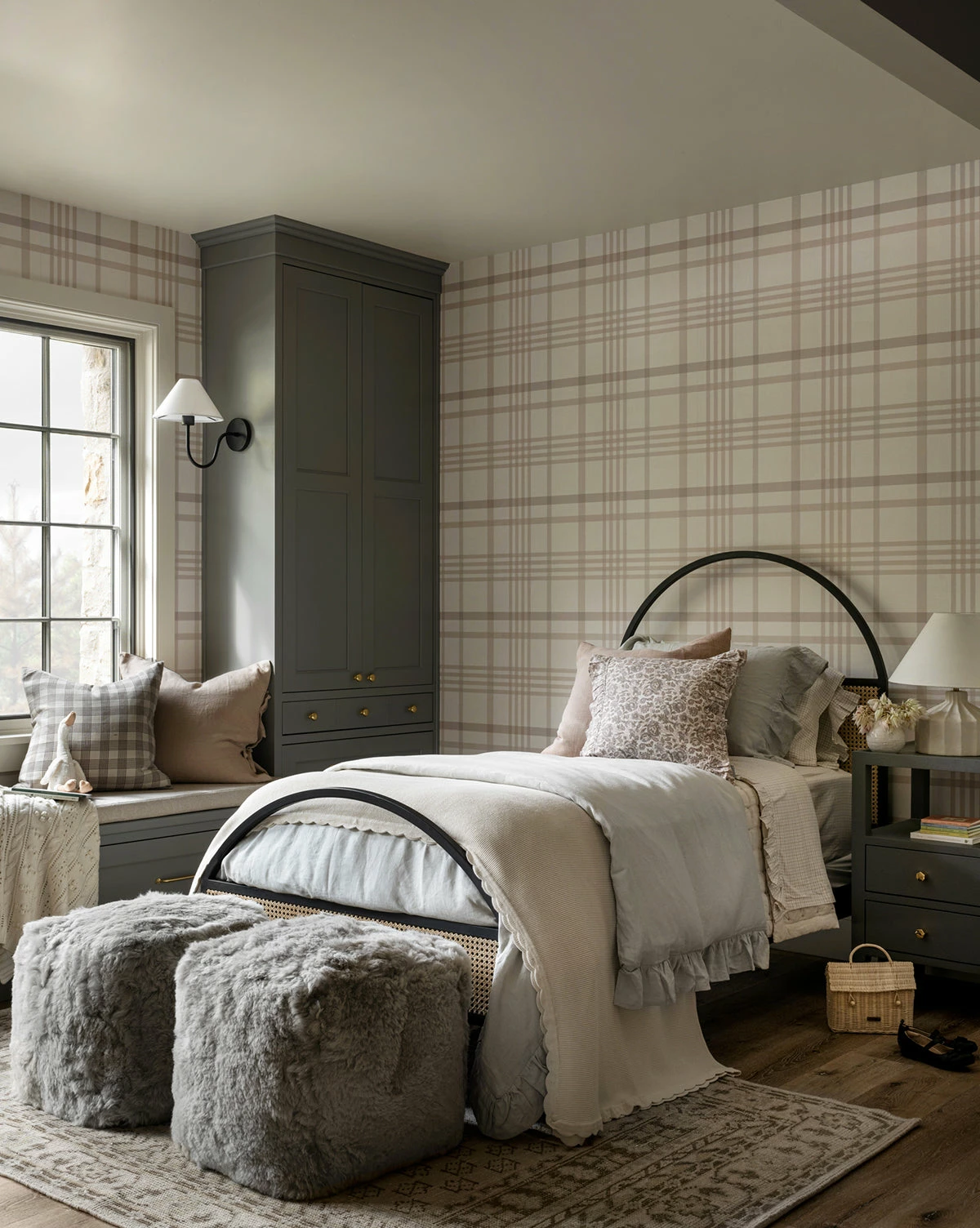 In a classic plaid style, the Rigby Plaid Wallpaper brings an airy, clean quality to this traditional pattern. Both of its colorways are simple and neutral, allowing it to grow with the room as tastes and preferences change. The pattern adds dimensional depth to the space with its varied shades of blue or taupe and crossed lines, bringing a timeless feel to children’s bedrooms.