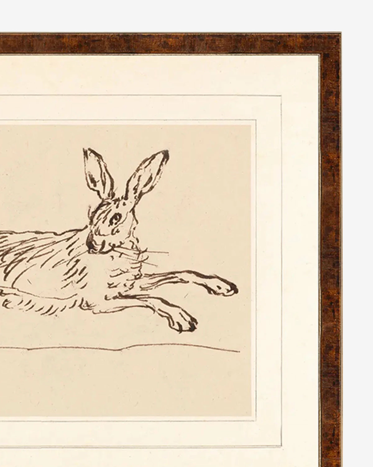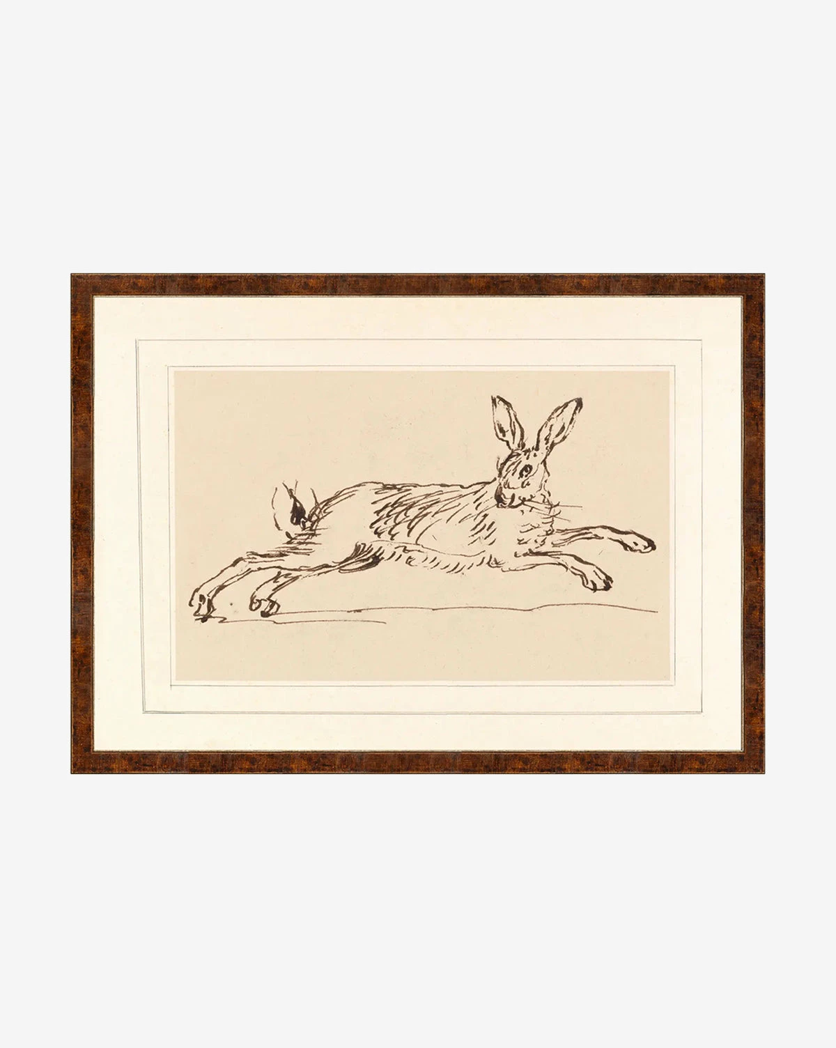 A 1720 sketch presented as a giclee print, Running Rabbit is captivating and expressive, reminiscent of imaginative illustrations. Framed within a wood frame with a tortoise shell colored veneer, the piece is a charming accent to any children’s room.