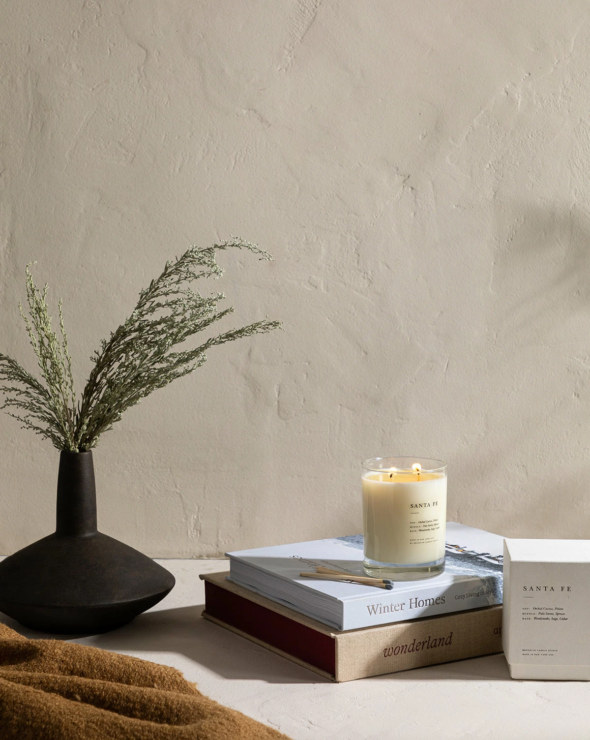 Earthy and smoky, the Santa Fe Candle combines notes of orchid cactus, palo santo, and sage. Its calming aroma is reminiscent of a desert landscape and nights warming by the fire. With a clear glass and soy wax, this hand-poured candle brings comforting warmth to your home.