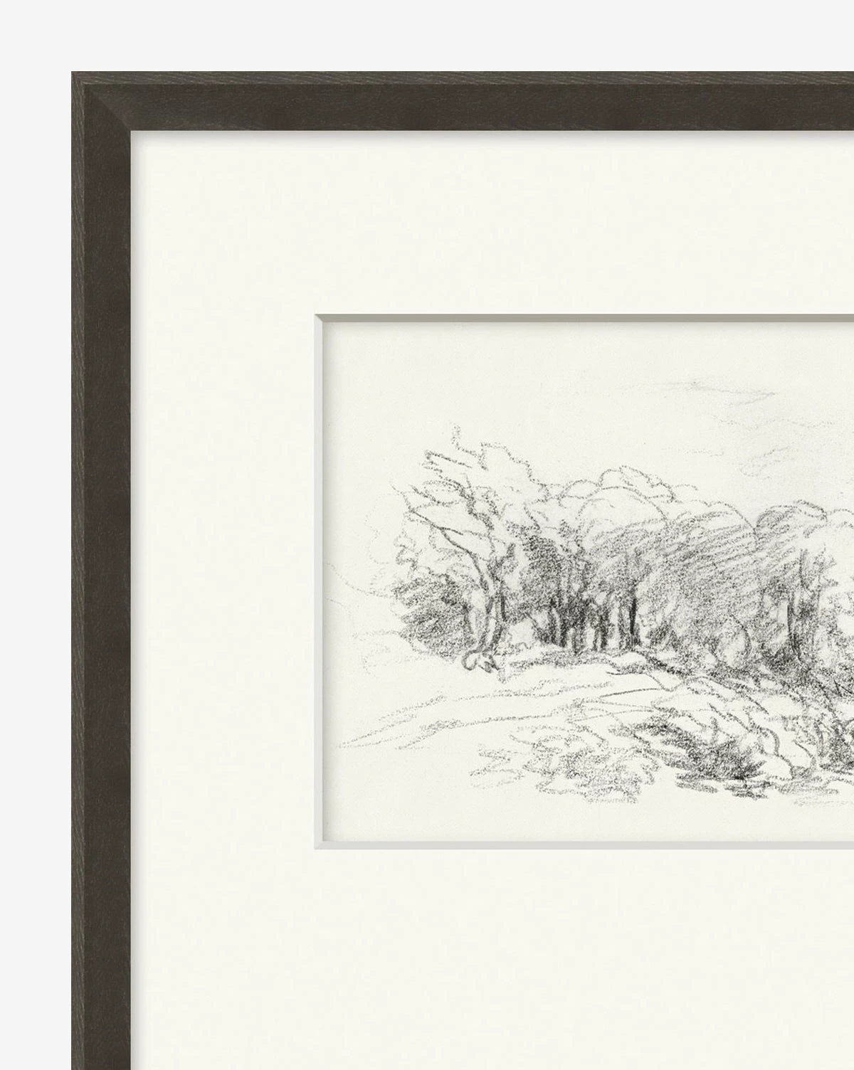 Sketched with expressive shading and lines, Sketch Landscape I has a warm and inviting feel. Its composition features a charming hillside scene with movement and detail. Framed in black woodgrain, the artwork has an elevated, museum-quality look.