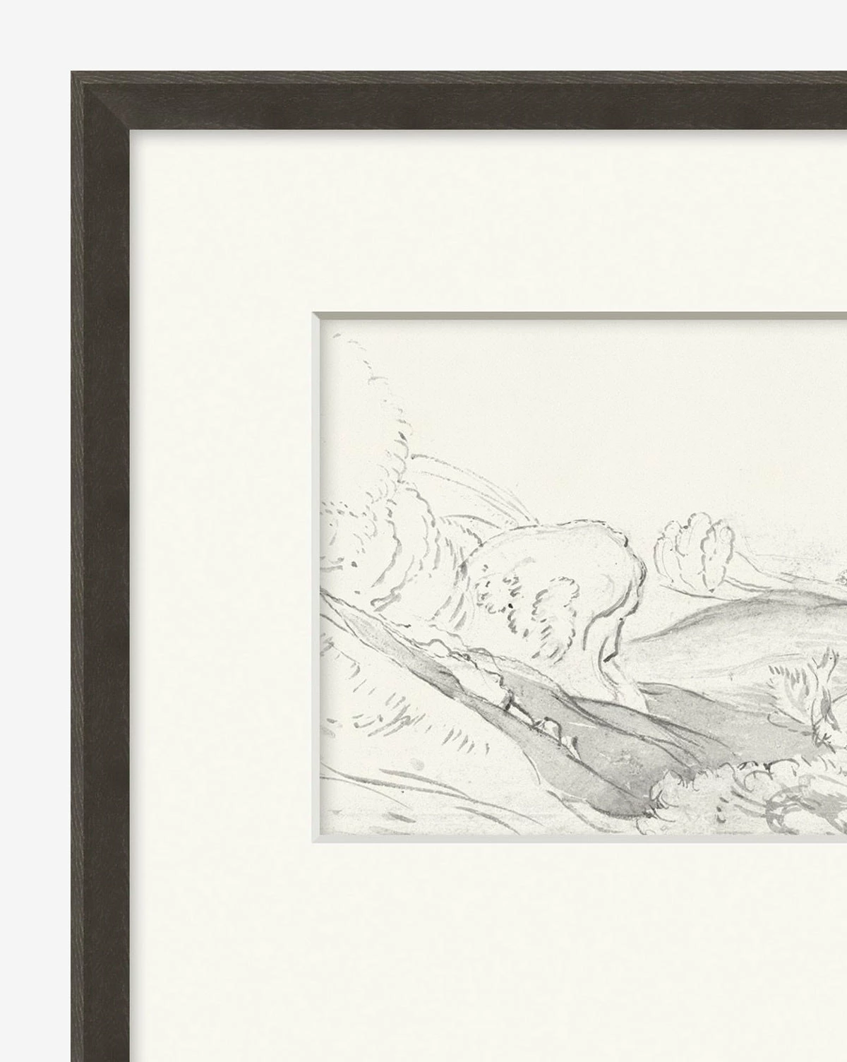 Sketched with expressive shading and lines, Sketch Landscape IIII has a warm and inviting feel. Its composition features a charming hillside scene with movement and detail. Framed in black woodgrain, the artwork has an elevated, museum-quality look.