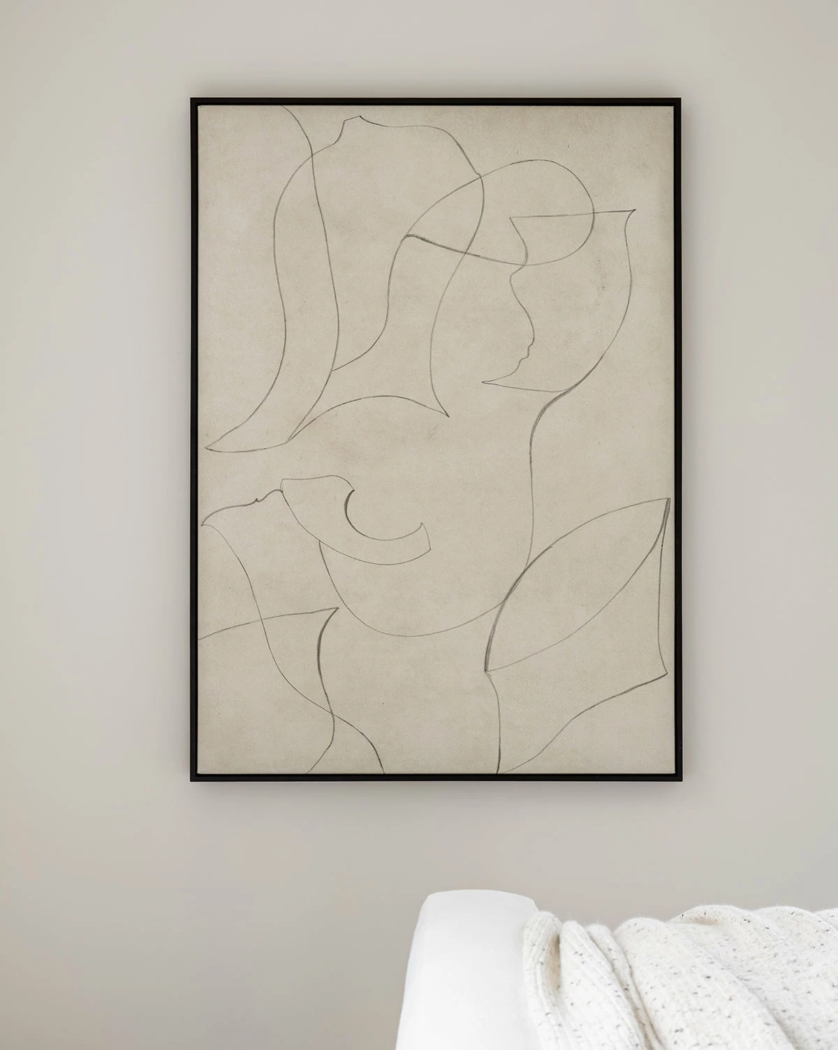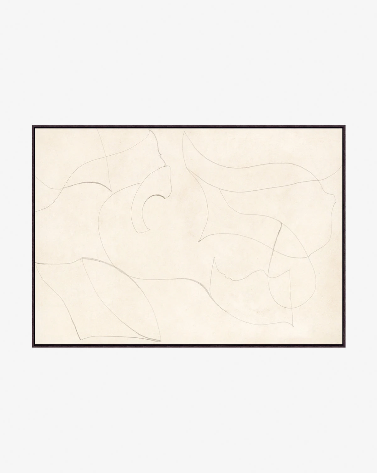 Abstract and light, Sketched Thoughts is a large giclee print on canvas that depicts an abstract composition of line. Using line work to sketch emotions and thoughts that are difficult to express, the piece is contemplative and reflects the fluidity of the thought process. Encouraging both movement and pauses through its connecting lines and negative space, Sketched Thoughts is a simple piece with depth that fills space with interest.