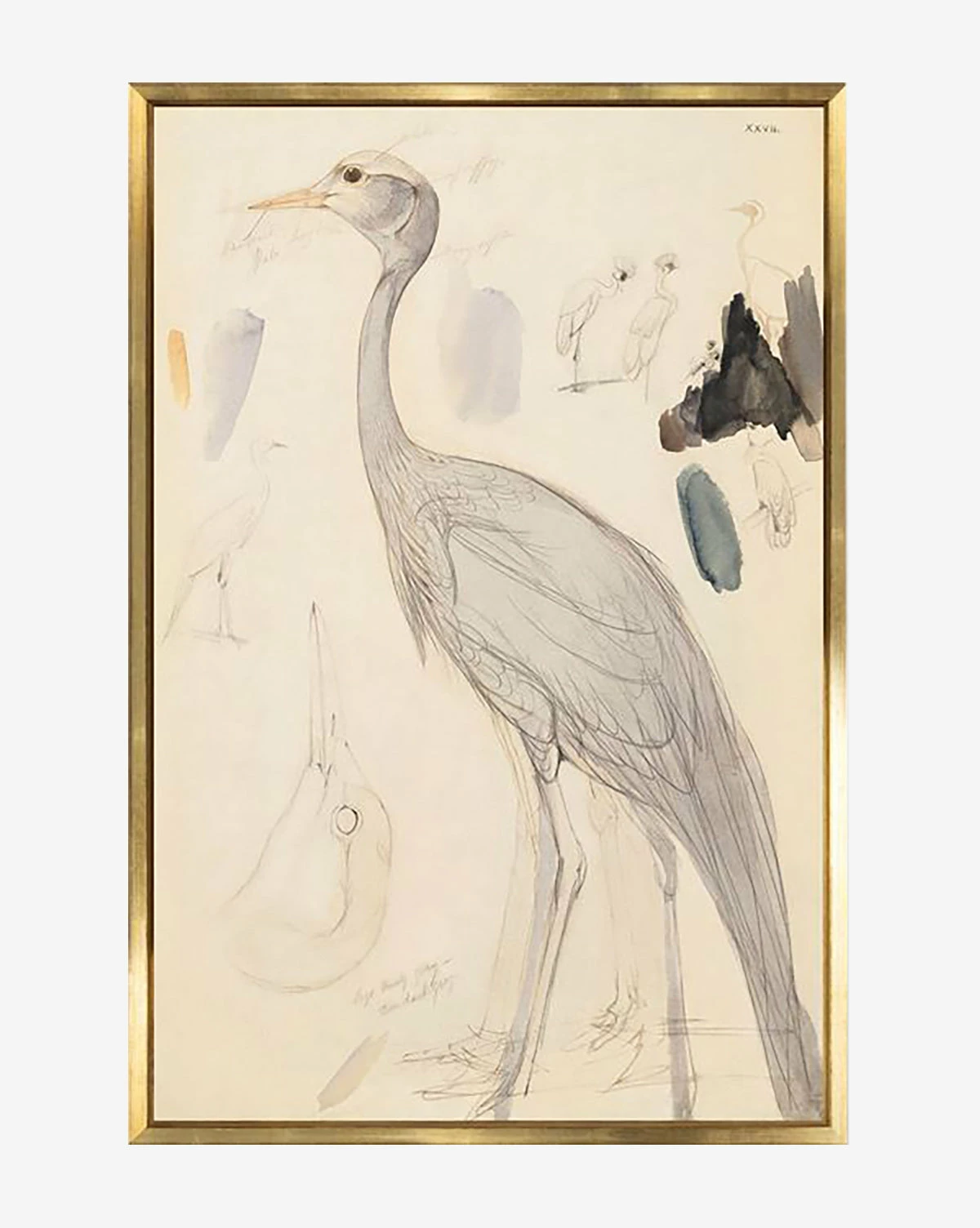 In an airy sketch painted in watercolor, Standing Crane depicts a tall bird in an unusual yet timeless style. With scattered, thick brush strokes and other small thumbnail sketches abstractly placed around the subject, Standing Crane has a thoughtful, intentional feel that adds an imaginative quality to your child’s spaces.