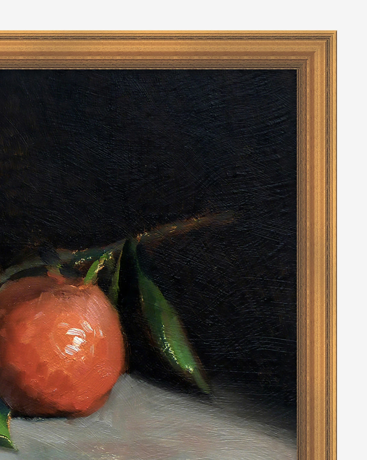 With a simple aesthetic, depth and contrast take center stage in our Still Life with Oranges portrait. The warm orange hue stands out against the black backdrop, as a simple frame adds the perfect amount of structure. Paired with our other fruit portraits, or as part of an eclectic gallery wall, this piece brings an added layer of dimension to your home design.