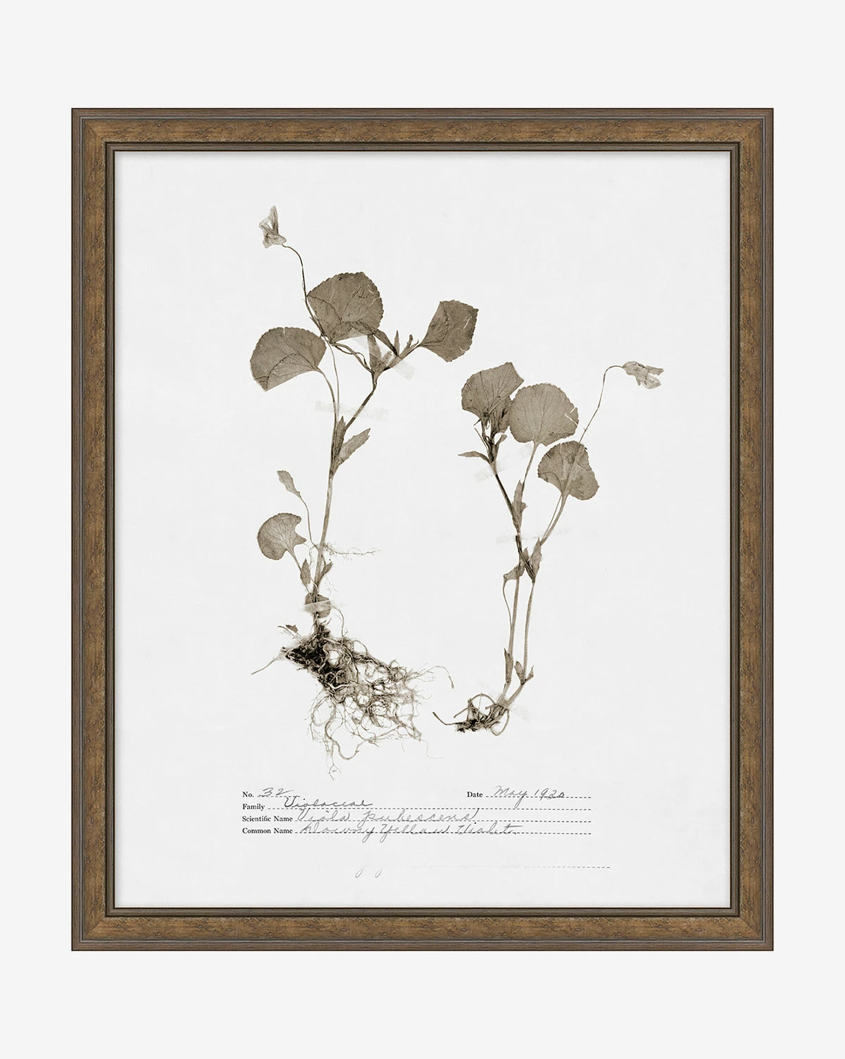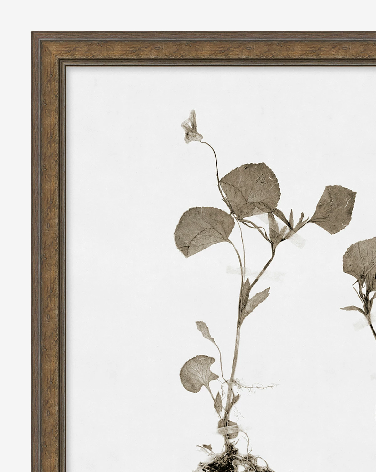 Mimicking pressed botanicals in a refined composition, Subdued Botanicals III has a monochromatic palette that puts emphasis on the shape and delicacy of each floral. A giclee print on paper, Subdued Botanicals III is mounted in a light walnut frame.