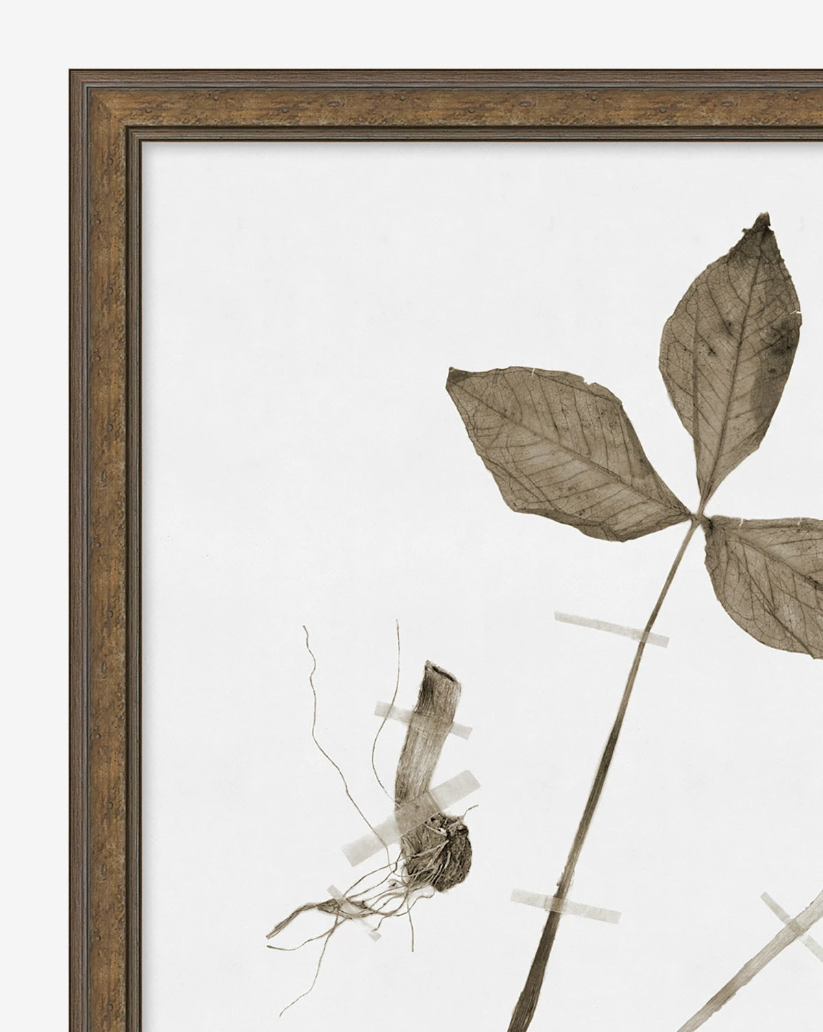 Mimicking pressed botanicals in a refined composition, Subdued Botanicals III has a monochromatic palette that puts emphasis on the shape and delicacy of each floral. A giclee print on paper, Subdued Botanicals II is mounted in a light walnut frame.