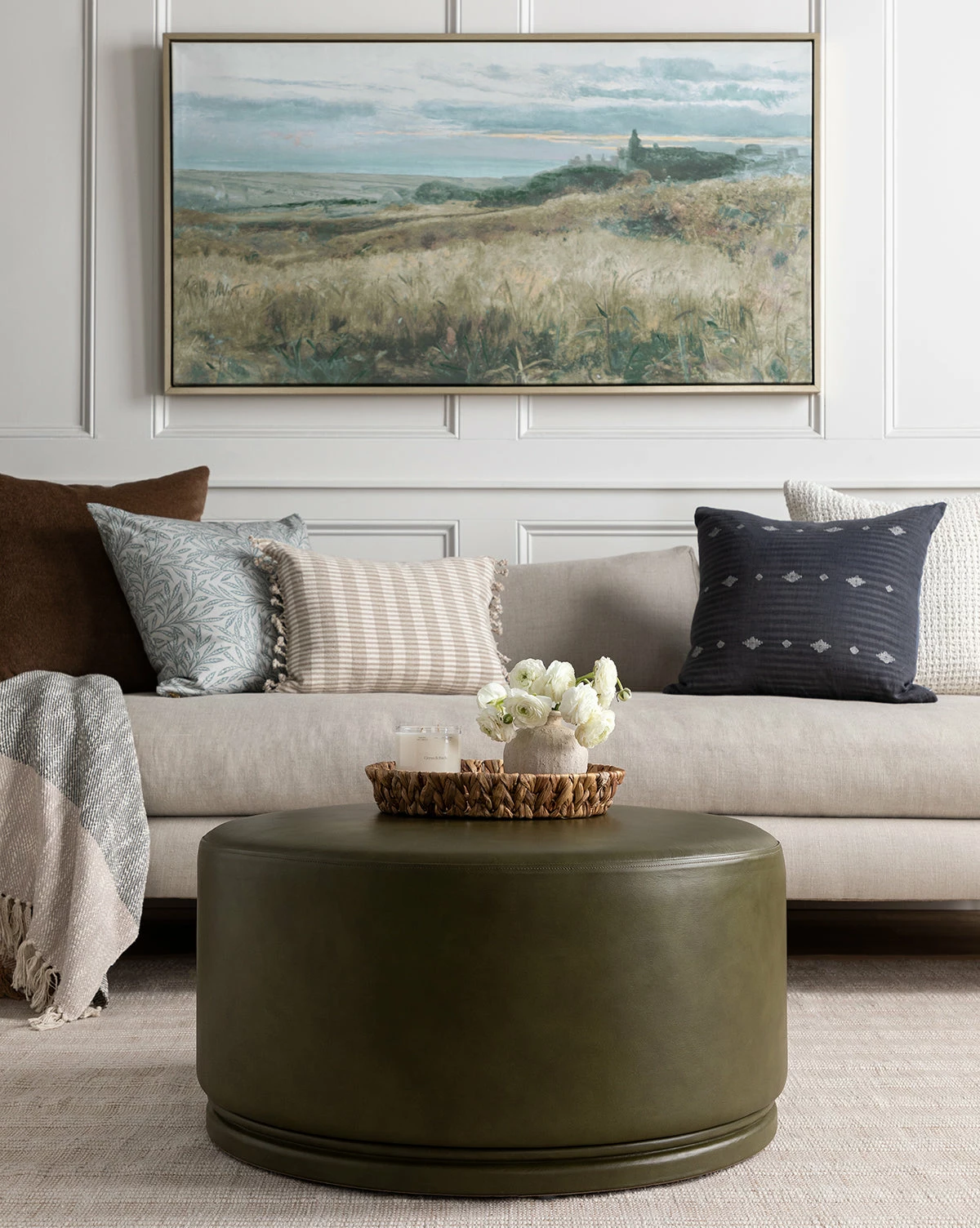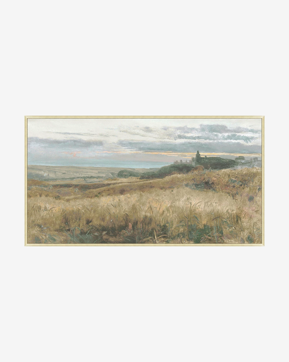 A calming pasture scene with distant trees and a cloud-filled sky comes to life with each detail in Sunset Fields. A museum-quality giclee print on canvas, the expressive artwork tells a story wherever the piece rests. The silver wood frame adds refined character to your wall treatments or dresser vignettes.