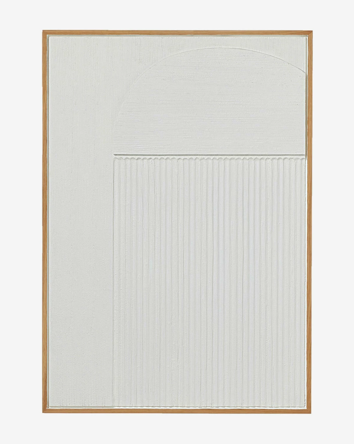 Subtle and contemporary, Vertical Texture is a textural art piece created with painted banana bark in a neutral yet captivating composition. Displayed within a natural oak veneer frame, the artwork brings museum-quality materials to your space.