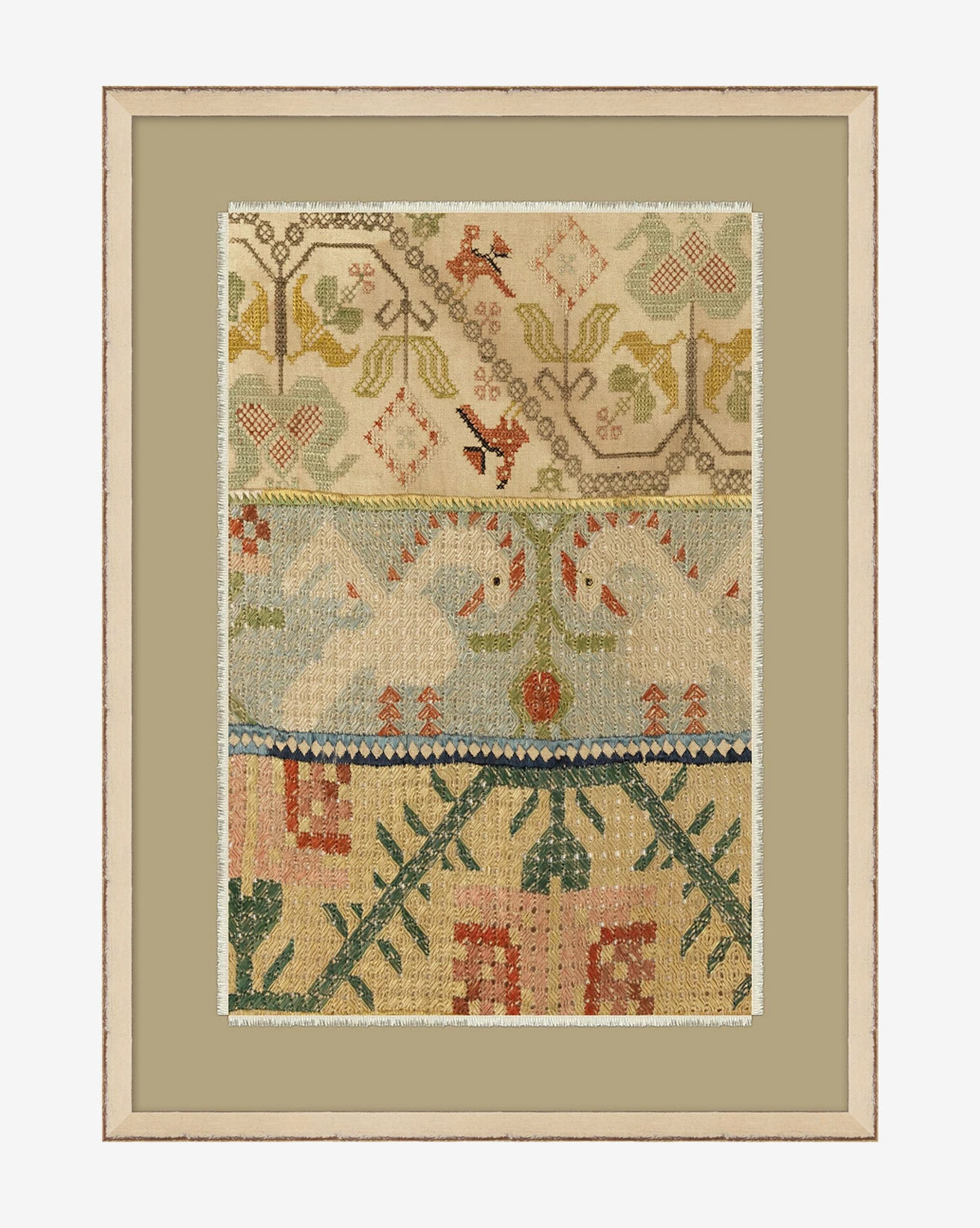 With charming detail and a decorative composition, Vintage Textile I brings the beauty of textile craftsmanship to your decor with a colorful palette. Framed within a distressed ivory wood frame, this giclee print on raw canvas features frayed edges and a sophisticated mounting on a mat. Â
