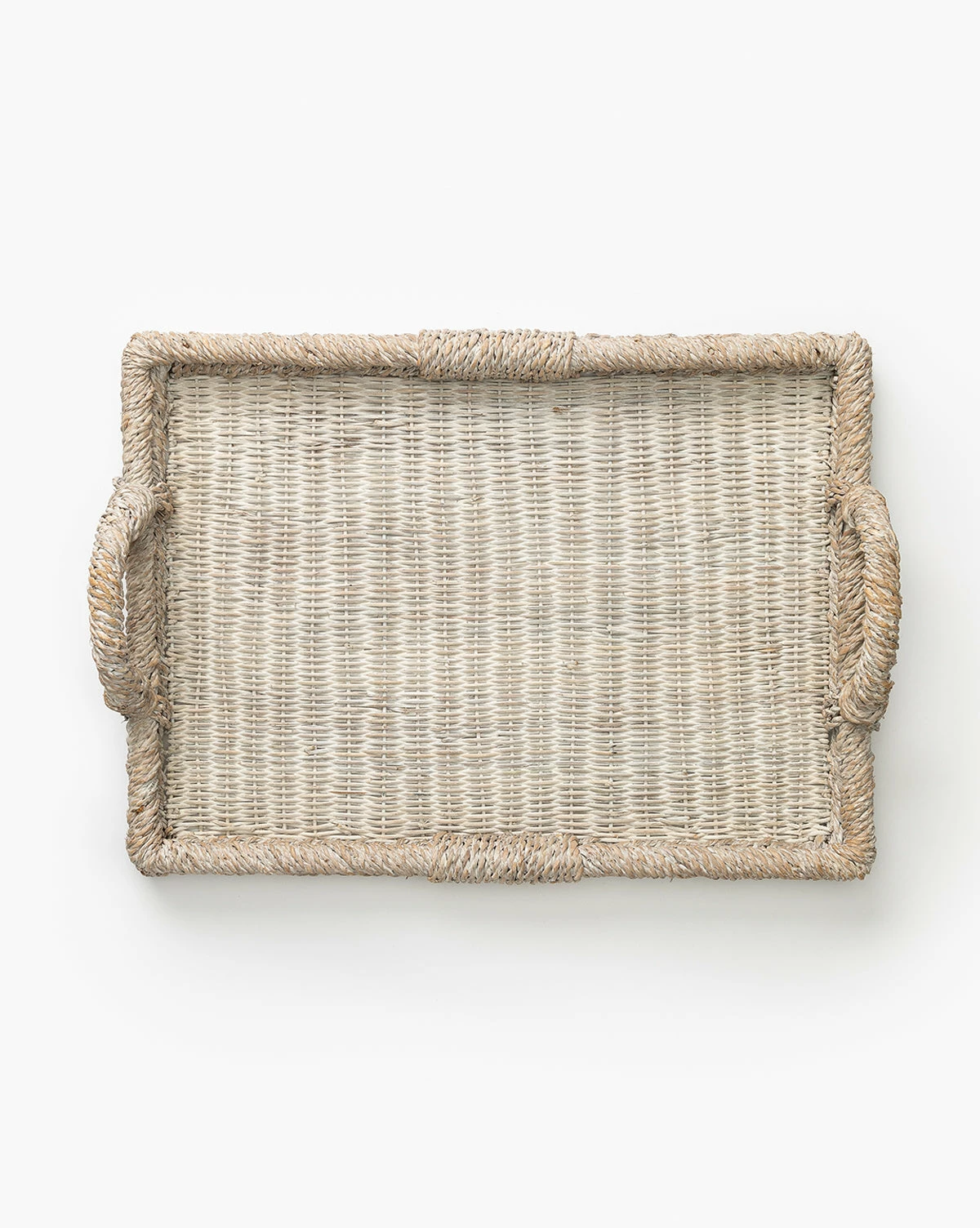 Made from tightly woven rattan, the Whitewashed Handled Tray boasts both form and function. Its white textural rattan sides and handles add welcome detail to a coffee table or console. Spacious and durable, the tray flawlessly displays decor from dried botanicals to books.