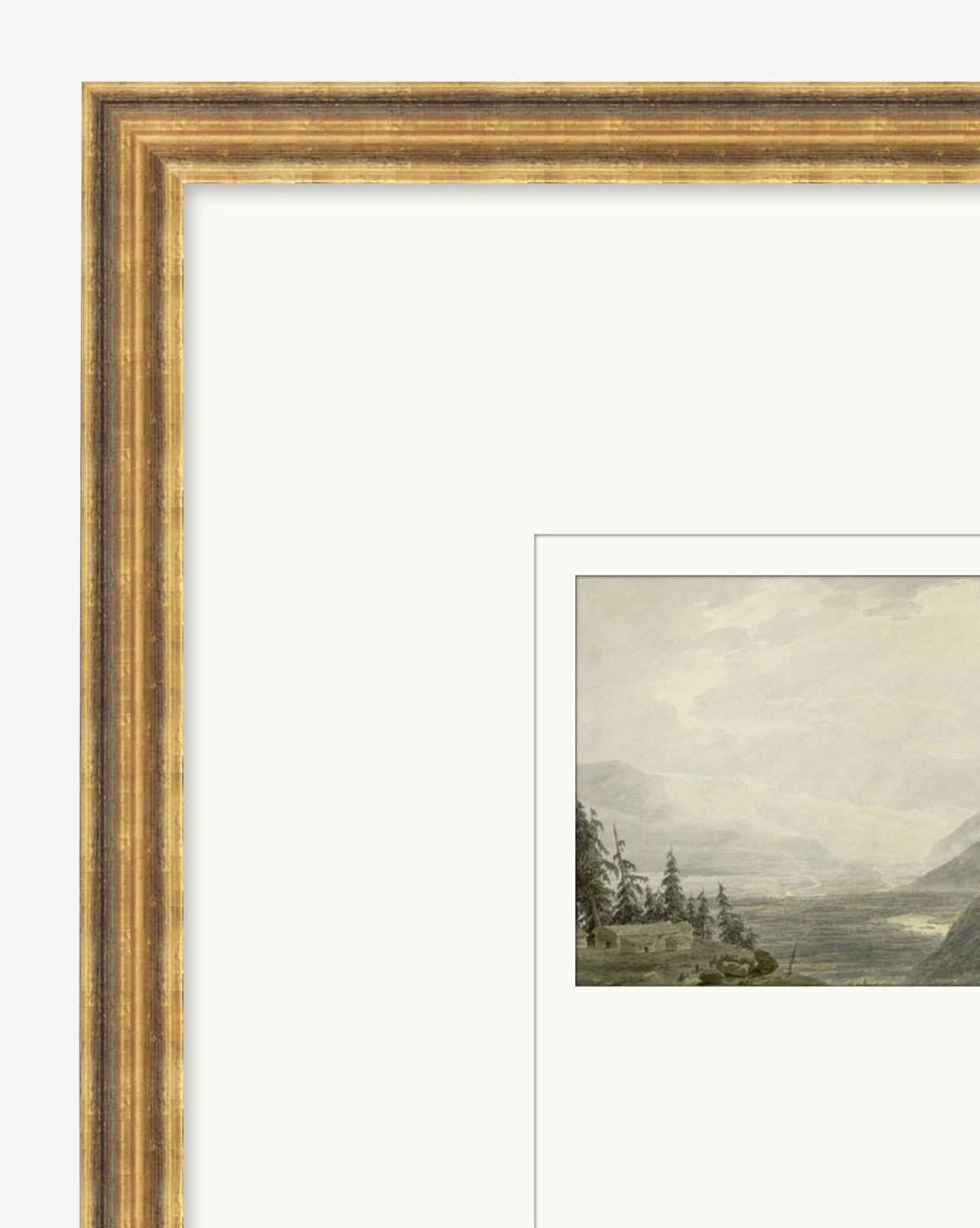 Conveying intricate detail in an ethereal mountain landscape, Window to the Mountains is a captivating piece through its use of color and its unique framing. A giclee print on paper that is mounted on double mats, the piece is finished in an antique gold and black frame for a gallery-quality treatment.